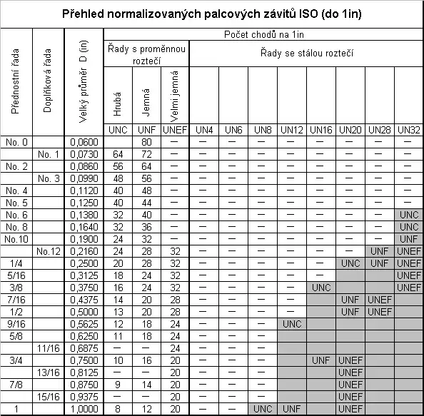 - závity do rozměru UN1/4" byly stanoveny v pravidelnější řadě a označeny ne zlomkem, ale pořadovým číslem (0 - 12). Z nich odpovídá rozměry a stoupáním Wz pouze No5 (1/8). Od UN1/4" jsou rozměry UN závitů shodné s Wz.