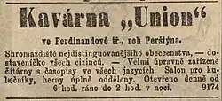 V roce 1923 se Karel Čapek emotivně postavil proti možnému rušení kavárny Union. V úvodníku Ohrožená památka z 23. ledna vyjmenovával intelektuály, především z oblasti literatury, kteří se v kavárně scházeli. Přirovnal "Unionku" k nejslavnějším literárním kavárnám Paříže a Berlína.[3]