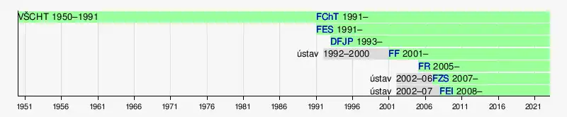 - Fakulta chemicko-technologická (FChT) – založena roku 1950 jako Vysoká škola chemická, později Vysoká škola chemicko-technologická, od roku 1991 jako Fakulta chemicko-technologická