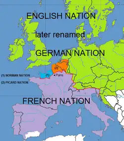 Příkladem může být univerzita v Paříži, která dělila studenty na francouzský, normandský, pikardský a německý národ (který zahrnoval britské ostrovy, Skandinávii, Svatou Říši včetně Českého království nebo Polsko a Uhry).