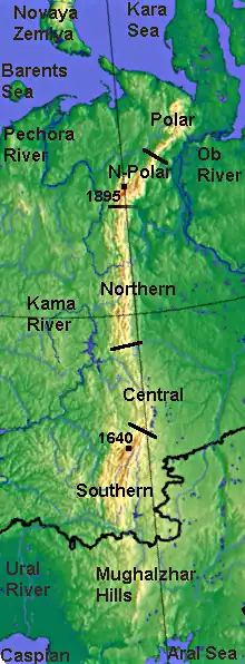 - Severní Ural: severně od toku řeky Kosvy (64° až 59° s. š., 59° v. d.)