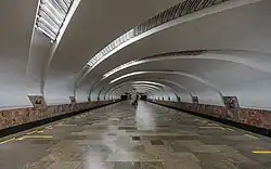 Stanice je jednolodní, kdy kolejová zeď je obložena mramorem a podlaha žulou.