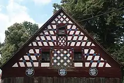 Obytná budova je patrová stavba, která byla postavena na půdorysu obdélníku. Původní roubené přízemí je zděné se třemi okenními osami a na něm je roubený věnec s hrázděným patrem, ve kterém se dochovala okna s původními dřevěnými rámy a trojúhelníkovými frontony. Obytný dům má sedlovou střechu krytou střešními taškami. Na roubeném věnci je obnovená výzdoba malovaných květinových terčů. Zadní štítové průčelí přechází do dekorativně členěného hrázděného štítu s typickým šikmým šachováním.[3][4][5]