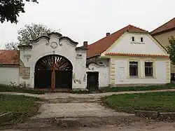 Na levé straně domovního průčelí se nachází brána, klenutá valeným obloukem. Zdobena je maltovým orámováním. V základu oblouku jsou patrné čtyřboké hlavice. Brána má výrazný klenák. Po stranách jsou užity pilastry s římsovitými hlavicemi, pod nimiž se nachází čabrakový motiv. Po stranách jsou esovitě prohnutá křídla s římsami, které jsou při středu zatočené ve voluty. Nad vjezdem, jemuž dominují velká dřevěná vrata, v horní části s paprskovitě skládanými prkny v podobě plaménků, je umístěno štukově vyvedené zrcadlo s členitým okrajem. Mezi bránou a obytným stavením je umístěna branka s pravoúhlým dveřním rámem, jejíž horní část, vycházející od stavení, tvoří profilovaná římsa, která je nad brankou zvednuta a zatočena ve volutu. Jak brána tak branka jsou kryty prejzy a natřeny omítkou bílé a vínové barvy.[2] Obě stavby jsou dokladem užití barokního tvarosloví v lidovém stavitelství.[3]