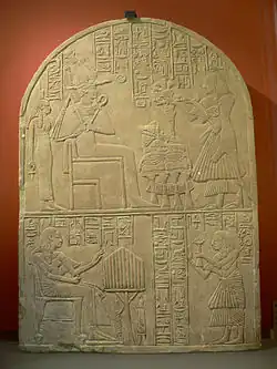 Zemřelý před Usirem a Esetou v horním registru votivní stély