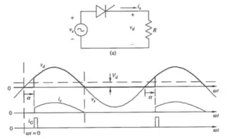 Při použití jednofázového jednocestného zapojení s odporovou a indukční zátěží dochází k akumulaci energie v indukčnosti a průběhy výstupního proudu a napětí se rozcházejí. K sepnutí dochází vysláním řídícího impulsu na řídící elektrodu, k vypnutí však dochází až po průchodu proudu nulou, vlivem čehož se může na výstupu objevit i záporné napětí. Pokud je použita nulovací dioda V0, je tento režim potlačen a výstupní napětí je vždy kladné, pro jeho velikost platí stejný vzorec jako výše.[4]
