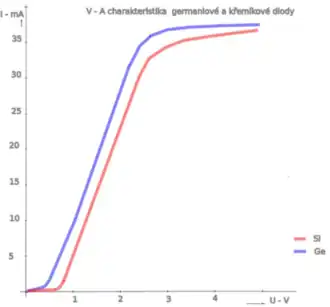 Průběhy typických V-A charakteristik germaniové (Ge) a křemíkové (Si) diody jsou uvedeny na obrázku.