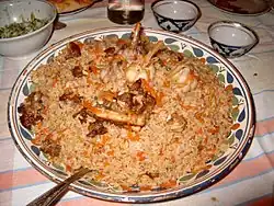 - Pilaf (plov), pokrm z rýže, kusů masa, cibule a zeleniny, někdy i ovoce, rozšířený po celé střední Asii.