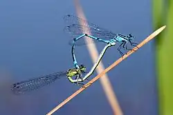 Kopulace – modrý je sameček, žlutozelená samička (šidélko páskované)