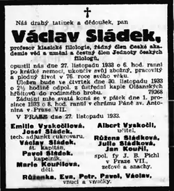- ↑ a b Lidové noviny, 30.11.1933, s.5, Václav Sládek zemřel, v systému Kramerius