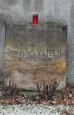 - ↑ Matriční záznam o narození a křtu Václava Viléma Štecha farnost Slaný