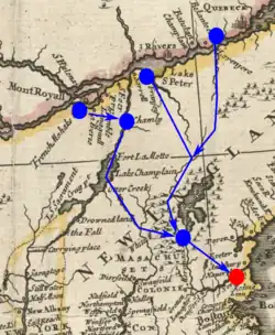 Vysoký britský důstojník a koloniální úředník Francis Nicholson a skotský podnikatel Samuel Vetch připravili na rok 1709 ambiciózní útočnou operaci, která se dosti podobala podobné akci neúspěšně provedené za války krále Viléma v roce 1690. Plán zahrnoval pozemní útok na Montréal skrze Champlainovo jezero a námořní přepad Québecu. Pozemní expedice čítající asi 1500 mužů včetně určitého množství Irokézů dosáhla sice Champlainova jezera, ale zde se v létě 1709 zastavila a čekala, přičemž byla sužována nemocemi, nedostatkem zásob a dezercemi. Nakonec se musela vrátit zpět, protože se dozvěděla, že z plánovaného námořního útoku na Québec sešlo, neboť britská flotila byla místo toho odvolána k bojům u Iberského poloostrova.[52][53] Po tomto fiasku se Britové ještě nevzdali. Schuyler a Nicholson zamířili na jaře roku 1710 do Londýna a vzali s sebou čtyři indiánské náčelníky, tři Mohawky a jednoho Mohykána, které z propagandistických důvodů titulovali jako „krále“, ačkoli tři z nich neměli mezi domorodci nijak významné postavení. Cílem bylo vzbudit zájem o události v Americe a snaha získat maximální podporu pro další akce. Indiánská delegace vzbudila v Anglii velkou pozornost, přijala ji dokonce i sama královna Anna. Nicholson a Schuyler dosáhli v zásadě svého. Královna podpořila expedici, kterou vedl Nicholson, a jíž se podařilo na podzim 1710 dobýt Port Royal. O rok později získal podporu i znovuoživený projekt na útok proti srdci Nové Francie.[54][46][55]