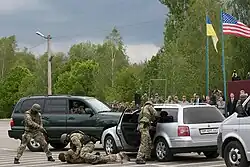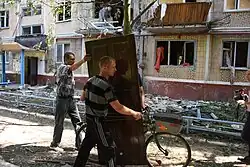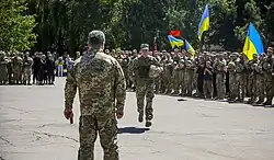 Válka na Donbase (na Donbasu) či válka na východní Ukrajině byl ozbrojený konflikt v letech 20142022 na východoukrajinském Donbasu, součást širší rusko-ukrajinské války. Probíhala mezi ukrajinskou armádou a dobrovolnickými ozbrojenými silami na jedné straně a Ruskem podporovanými proruskými separatisty a vojenskými jednotkami skrytě formovanými ozbrojenými silami Ruské federace na druhé straně.[67][68][69][70] Ruská vláda účast svých pravidelných jednotek popírala až do invaze z února 2022.[71][72][73][74][75]