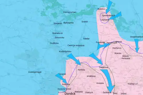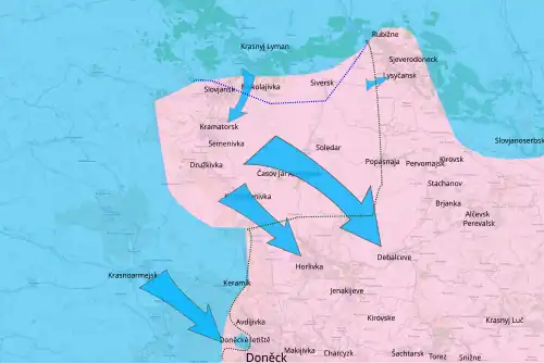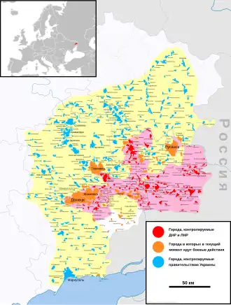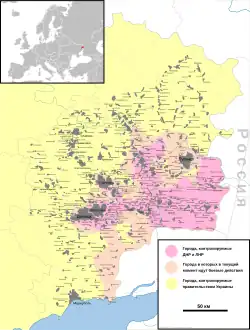 Povstalecká území před ruskou invazí 24. února 2022:      města ovládaná separatistickými republikami      města ovládaná Ukrajinou      města, kde probíhaly boje      území kontrolované Ukrajinou