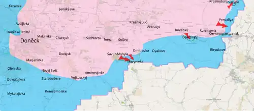 Dne 22. srpna 2014 došlo k rozsáhlé protiofenzivě proruských povstalců, během níž byl obsazen přístav Novoazovsk a strategická výšina Savur-Mohyla. Ukrajina tyto události označila za přímou ruskou invazi a z její iniciativy byla 28. srpna svolána Rada bezpečnosti OSN.[28][29] Dle ukrajinského prezidenta Petra Porošenka se jednalo o podporu povstalců ruskou armádou, což vůdce separatistů Alexandr Zacharčenko popřel, ale připustil, že na straně povstalců bojovalo mnoho ruských dobrovolníků, z nichž někteří sloužili nebo nadále slouží v ruské armádě a během bojů byli dle tvrzení povstalců na dovolené.[89]