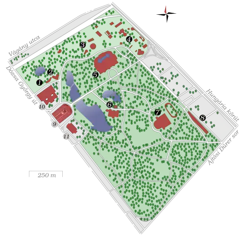 V parku se nachází stálý cirkus, zoologická zahrada (Állatkert), restaurace Gundel, termální lázně Széchényi, hrad Vajdahunyad, dopravní muzeum, několik umělých jezer. Do roku 2013 se v parku nacházel také zábavní park Vidám park.