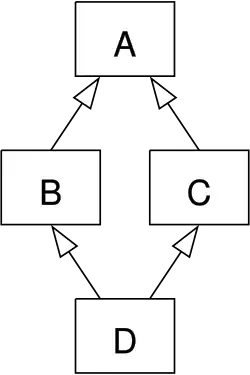 Ajako na dva rozdílné. Tedy předek třídyBje z tohoto pohledu úplně jiná třídaAnež třídaAjakožto předek třídyC. Pokud dědičnost ze třídyAdo obou třídBiCje deklarována jako virtuální pak C++ vytvoří pouze jeden objektAa zajistí jeho správné používání. Pokud jsou virtuální a nevirtuální dědičnosti namíchány, pak C++ vytvoří společný jeden objektApro virtuální dědičnost a jeden pro každou nevirtuální. Při volání metod musíme v C++ explicitně určit, která rodičovská třída bude při volání použita. - Eiffel má plnou podporu pro vícenásobnou dědičnost. Potomek má detailní kontrolu nad tím, co a jakým způsobem z jednotlivých předků dědí (možnost přejmenování, úpravy viditelnosti, explicitního výběru jedné z definic). Jsou definována exaktní pravidla, kdy můžou být vícenásobně zděděné definice automaticky sloučeny a kdy musí být konflikt explicitně vyřešen v kódu potomka.[1]