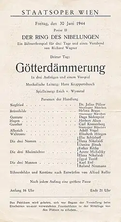 Poslední představení v původní budově Vídeňské opery se konalo 30. června 1944. Po letních divadelních prázdninách už nebyl provoz divadla obnoven, neboť od 1. září 1944 bylo Josephem Goebbelsem vyhlášeno uzavření všech divadel v Říši. Poslední představení – Wagnerův Soumrak bohů, symbolicky předznamenalo další osud divadelní budovy. Scénická poznámka na závěr díla uvádí: „Sál bohů se rozpadá v záři jasných plamenů. Opona se spouští v okamžiku, kdy plameny zcela obklopí bohy“.