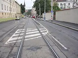 - V úseku 100 metrů (nejméně 50 metrů) před zastávkou má být sveden silniční provoz z tramvajového pásu pomocí dopravních stínů vyznačených šikmými rovnoběžnými čarami, podélných čar souvislých a podélných (vodicích) prahů umožňujících přejíždění. V Praze se využívá dopravních knoflíků a betonového podélného prahu v délce 20–50 metrů. Svislé oddělovací prvky (např. směrovací desky) se nepoužívají.