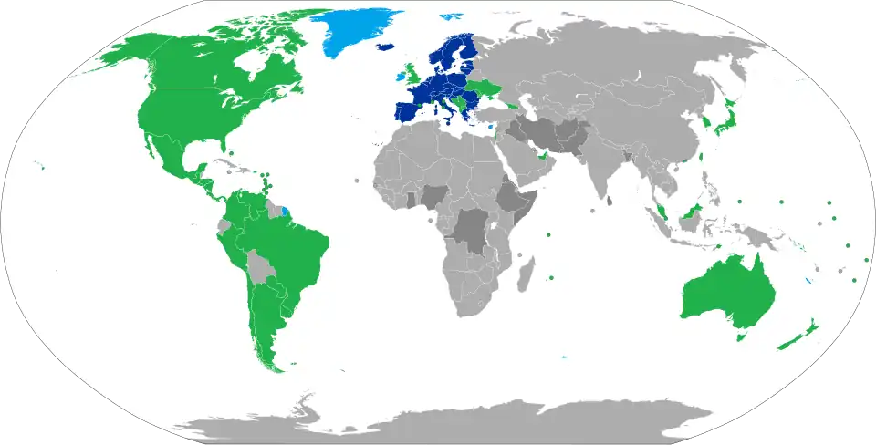 | Směrnice 2004/38/ES definuje právo na volný pohyb občanů Evropského hospodářského prostoru (EHP), který zahrnuje Evropskou unii (EU) a tři členy Evropského sdružení volného obchodu (ESVO), Island, Norsko a Lichtenštejnsko.[2][3][4] Švýcarsko, které je členem ESVO, ale není členem EHP, není směrnicí vázáno, ale má samostatnou bilaterální dohodu o volném pohybu s EU. Volný pohyb mezi Švýcarskem a ostatními zeměmi ESVO probíhá v souladu s úmluvou ESVO.[5] Všechny tyto země tvoří jednotný trh EU.