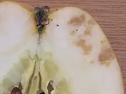 Často může být nedostatek vápníku u rostlin výsledkem nízké transpirace celé rostliny nebo postižené tkáně. Rostliny jsou citlivé na lokalizovaný nedostatek vápníku, protože vápník není přepravován floémem. Vedle chloróz je charakteristická zvláště chlorotická kropenatost mladších listů. Symptomy se prohlubují na mladších listech. Příznaky nedostatku vápníku se objeví nejprve jako lokalizované odumírání tkáně vedoucí k zakrslému růstu rostlin. Některé příznaky nedostatku vápníku jsou zcela specifické u některých rostlin. U zelí, kapusty a růžičkové kapusty se projevy nedostatku vápníku objevují jako zhnědnutí uvnitř hlávek a černé nekrózy nebo jako černání vrcholových částí nebo podobně jako u salátu černání špiček listů. Fyziologická skvrnitost jablek také hořká skvrnitost jablek nebo pihovitost jablek je fyziologická porucha která se projevuje především na mladých bujně rostoucích stromech s malou násadou velkých plodů. U paprik a rajčat tato porucha ve výživě rostliny vápníkem nápadně postihuje plody. Porucha je někdy nazývána černání pupku rajčete.[30]