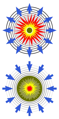 - Výbuch supernovy – představuje společně s kvazary doposud největší známý okamžitý energetický zdroj ve vesmíru. Vzniká gravitačním zhroucením jádra hvězdy obsahujícího těžší prvky , které v jejím jádru vznikly termonukleární reakcí. Při této explozi dochází k zániku hvězdy o velikosti minimálně desetinásobku našeho Slunce za vzniku neutronové hvězdy a uvolnění obrovského množství energie ve formě elektromagnetického záření a neutrin. Výbuch supernovy v blízké části naší galaxie tak může výrazně ovlivnit životní podmínky na Zemi a v extrémním případě vést až k likvidaci organických forem života.
