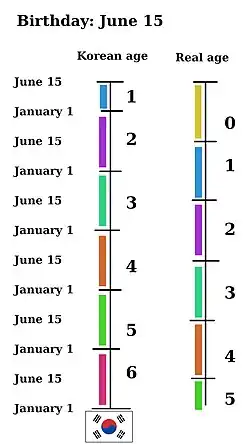 Korejci slaví výročí svých narozenin, i když roky života se připočítávají nikoliv o narozeninách, ale o Novém roce. Vzhledem k tomu, že jeden rok má Korejec od narození a druhý od nejbližšího nového roku, člověk, který se narodil před koncem roku – např. 29. den 12. měsíce (tradičního lunárního kalendáře) – měl o dva dny později (od 1. dne 1. měsíce) věk dvou sal, dvou let.