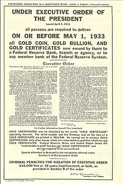 6. března s využitím válečného statutu, který neměl byl zrušen, vydal prezidentskou proklamaci číslo 2039, které zakazovalo hromadění „zlatých nebo stříbrných mincí nebo slitků nebo měny“ pod pokutou 10 000 $ a/nebo až pět až deset let vězení.“