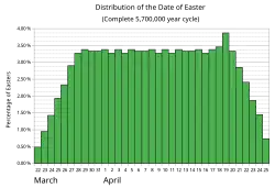 Datum Velikonoc se tedy může lišit mezi jednotlivými roky až o více než jeden měsíc (od 22. března do 25. dubna). Jarní rovnodennost je stanovena „úředně“ na 21. březen podle gregoriánského kalendáře bez ohledu na astronomickou skutečnost (která se může až o dva dny lišit). V některých protestantských zemích (například Německu, Švédsku a Dánsku) se ale Velikonoce slavily po několik desetiletí 18. a 19. století podle astronomické skutečnosti.