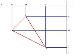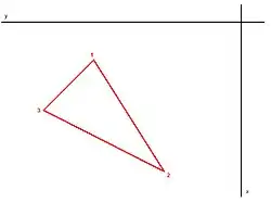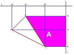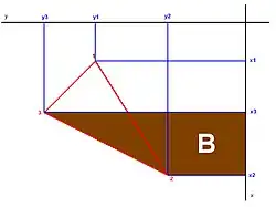 Příklad výpočtu bude ukázán na ploše trojúhelníku. Jeho lomové body jsou označeny čísly 1, 2 a 3 a body pak mají souřadnice: