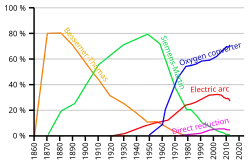 Několik let po Bessemerovu způsobu zavedl sir William Siemens (původem z Německa) tzv. Siemensův-Martinův proces zkujňování železa. Oxidace příměsí probíhala v Siemensově-Martinově peci, kterou lze opatřit podle typu surového železa vyzdívkou zásaditou nebo kyselou. Vytápění je na rozdíl od ostatních způsobů vnější. Siemensův-Martinův způsob vytlačil Bessemeraci díky hospodárnějšímu provozu a snadnější regulaci složení oceli.[2]