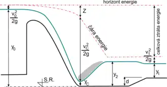 kde [m] je výška hladiny ve zdrži či nádrži nad srovnávací rovinou (zde za ni považujeme dno vývaru), [-] Coriolisovo číslo (při těchto výpočtech se obvykle uvažuje ), [ms−1] přítoková rychlost (rychlost před jezem nebo přelivem hráze) a [ms−2] tíhové zrychlení. Energetická výška v patě přelivné plochy je