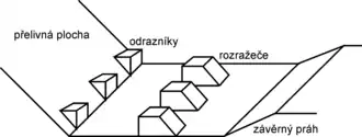 Rozražeče jsou v jedné nebo více řadách pravidelně rozmístěné bloky vhodného tvaru (vzhledem k vysokým rychlostem ve vývaru hrozí nebezpečí kavitace) a velikosti umístěné na dně vývaru. Je známo i jejich umístění na závěrném prahu, navržené Rehbockem.