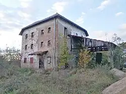 Ze severovýchodní strany je k objektu přistavěn prkenný přístavek s pultovou střechou. Fasáda domu vedle přístřešku je v prvním a druhém patře prolomena pravoúhlými vstupními otvory a ve druhém patře navíc také dvěma segmentově klenutými okenními otvory. Na protilehlé boční fasádě jsou asymetricky umístěny dva pravoúhlé otvory, které jsou zazděné; v patrech je po jednom segmentově zaklenutém okně.[2]