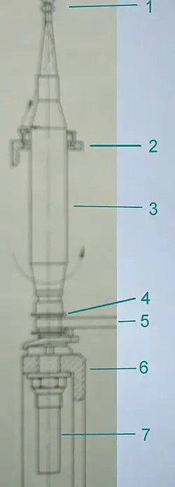 - Vřeteno na prstencových dopřádacích a skacích strojích je co do počtu nejužívanější druh. Na nákresu vpravo je příklad vřetena ze strojů na dopřádání vigoňových přízí: Vřeteno (7) je uloženo na vřetenové lavici (6) a je poháněno přes přeslen (4) cca desetimilimetrovým popruhem z textilního materiálu (5) nebo tangenciálním řemenem o šířce několika centimetrů. Na vrcholu vřetena je nástavec (1), pomocí kterého se snižuje napětí příze při průchodu prstencovou lavicí (2) k potáči (3). Princip prstencového předení umožňuje otáčky vřeten asi do 20 000/min.