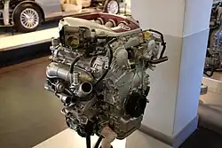 Motor se 24 ventily ovládanými dvěma vačkovými hřídeli v hlavě s proměnným časováním ventilů (pouze sání). Blok je z hliníkové slitiny s 0,15 mm (0.006 in) plazmově přivařené vložky válce. Turbíny pro dvě turbodmychadla IHI jsou integrována do výfukového potrubí pro snížení hmotnosti a posílení rovnováhy vozidla. Motor má také sportovní tlakové mazání řízené termostatem.