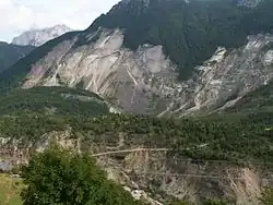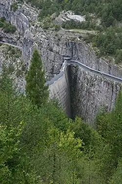![]() Přehrada při pohledu z městečka Longarone, vlna při katastrofě by zakryla celé nebe na této fotografii | |