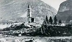 ![]() Pohled na vesnici Longarone, která byla pod přehradou, s rozsahem poškození po přehnání přílivové vlny | |