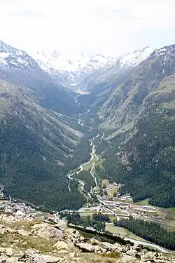 V zadní části údolí, na severním svahu skupiny Bernina, leží ledovec Roseg a východně od něj Piz Roseg.