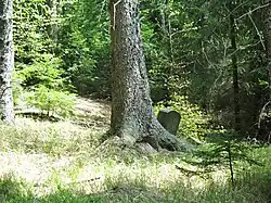 ![]() Valdštejnská skála na jihozápadním úbočí Bučiny v Lužických horách. Uprostřed nejvyššího bloku je patrný kříž | |