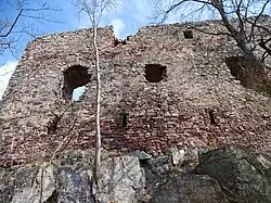 Deset až dvacet let po založení hradu byla postavena nová hradba nad hranou šíjového příkopu, která částečně zesílila opevnění i na východní straně. Na čelní straně byla prolomena bránou přístupnou po mostě přes příkop. Z architektonických detailů brány se dochovaly boční špalety, segmentový záklenek a otvor pro zasunutí závory. Původní brána jádra proto byla zazděna a nahrazena novou, která se nacházela nejspíše v prostoru pozdějšího bergfritu. Asi v první třetině čtrnáctého století byla na místě druhé brány postavena volně stojící velká věž – bergfrit.[25]