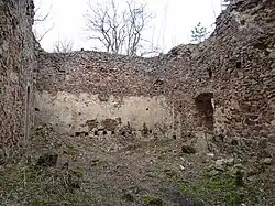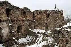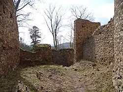 Hrad byl původně dvoudílný. Na vstupní straně se nacházelo rozměrné předhradí, na kterém se nedochovaly žádné stopy zástavby. Chránil je příkop, před nímž je patrný nízký val. Na západní straně má val charakter mohutné zdi z nasucho kladených kamenů.[20]