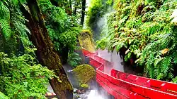 Turistické chodníky v bujném spodním patře lesa (Termas Geométricas, Coñaripe, Los Ríos) -