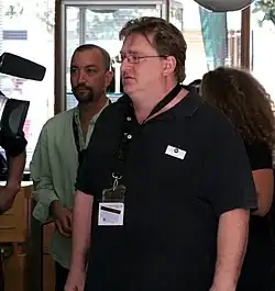 Gabe Newell (v popředí) a Doug Lombardi (v pozadí), 2007