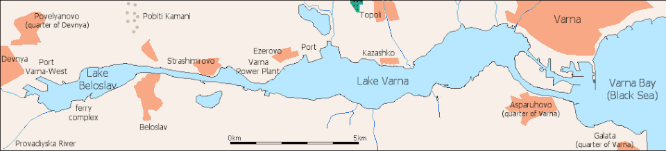 - ↑ Některé zdroje (mapy) udávají název řeky odvodňující jezero jako řeku Varna.