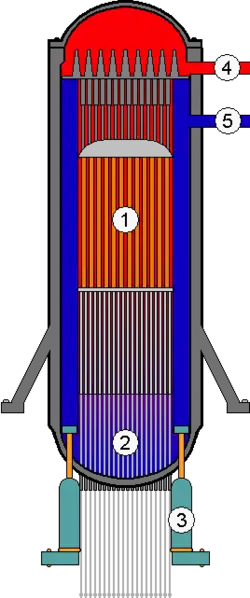 Tlaková nádoba reaktoru ABWR. 1: aktivní zóna, 2: regulační tyče, 3: cirkulační čerpadla, 4: parní kolektor, 5: napájecí potrubí