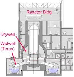 Nákres kontejnmentu Mark I (Drywell – suchá část kontejnmentu, Wetwell (Torus) - mokrá část kontejnmentu (Toroid), Reactor Bldg - Budova reaktoru)