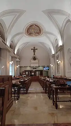 • Druhé patro. V mezipatře má odpočinkovou terasu se zahradou, spojenou s mimoúrovňovým vstupem do sousední grotty, která slouží jako kavárna. Badatelům slouží dva reprezentační sály: Sala Leonina v čele se sochou sv. Tomáše Akvinského, kterou vytvořil Cesare Aureli kolem roku 1910, a na zadní straně s bustou papeže Lva XIII., slouží jako studovna tištěných knih 17.-21. století, obrazových dokumentů a příruční knihovna encyklopedií, italských historických, zeměpisných a náboženských knih. Sousední menší sál (sala Leonina minor) slouží ke konzultacím a příležitostným akcím.[26] Z podnětu papeže Benedikta XVI. byla studovna roku 2016 nově upravena.