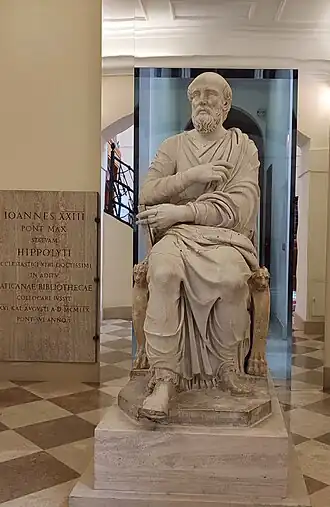 • V přízemí je recepce a šatna, vstup do studoven je vyhrazen čtenářům s čipovou služební kartou. Ostatní návštěvníci mají přístup k prohlídkám pouze v doprovodu průvodce a v předem stanovených hodinách. Vstupnímu atriu vévodí kopie sochy svatého Hippolyta Římského. Originál byl nalezen v roce 1551 na Via Tiburtina v Římě, vystaven v římském kostele San Lorenzo in Damaso[24]. Tato kopie se sbírkou kardinála Ottoboniho byla předaná do Vatikánských muzeí a po restaurování v roce 1959 darovaná papežem Janem XXIII. knihovně.