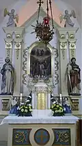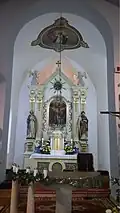 - Římskokatolický farní kostel Všech svatých, jednolodní, původně barokní stavba se segmentově ukončeným presbytářem a věží tvořící součást stavby z roku 1667. Úpravami prošel v letech 1740 a 1893, kdy získal neoklasicistní fasádu po požáru v šedesátých letech 19. století. V roce 1925 byl kostel restaurován. Interiér je zaklenut segmentovými a valenými klenbami. Zařízení je neobarokní a neoklasicistní ze začátku 20. století. Hlavnímu oltáři dominuje obraz s tematikou všech svatých, na bocích oltáře se nacházejí sochy sv. Petra a sv. Pavla, uprostřed oltáře je neobarokní tabernákulum. Ve svatyni se nacházejí i dva boční oltáře: oltář Božského srdce Ježíšova a oltář Panny Marie. Na stropě ve svatyni je nástěnná malba s motivem nanebevzetí Pána. V kostele se nachází barokní dřevěná křtitelnice. Varhany jsou jednomanuálové, vyrobeny byly firmou Rieger, typ Opus 2502, z 20. století. Lavice jsou z roku 1970. Na stěně vedle ambonu se nachází barokní obraz zobrazující tajemství růžence. Jednotlivá zastavení křížové cesty po stranách lodě jsou barvotiskové reprodukce. Zachovaly se zde dvě polychromované barokní sochy Růžencové Panny Marie a sv. Jana Nepomuckého.[3] Fasáda kostela je hladká, věž je členěna lizénami a ukončena střechou ve tvaru jehlanu. Ve zvonici se nacházejí 3 zvony - jeden z roku 1906 a dva z roku 1922 od zvonaře Alojze Kurbela.